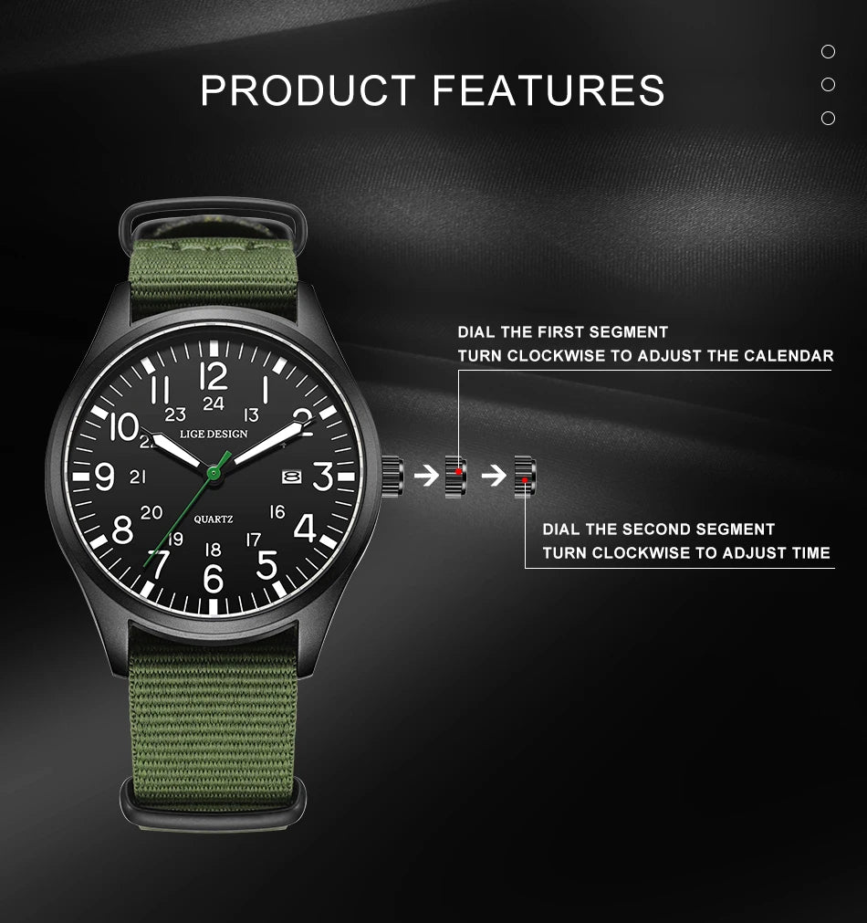 LIGE Relógio Masculino de Luxo Top de Linha Quartz Data Nylon Couro À Prova D'água Luminoso Militar Esportivo Para Homens relógios masculinos