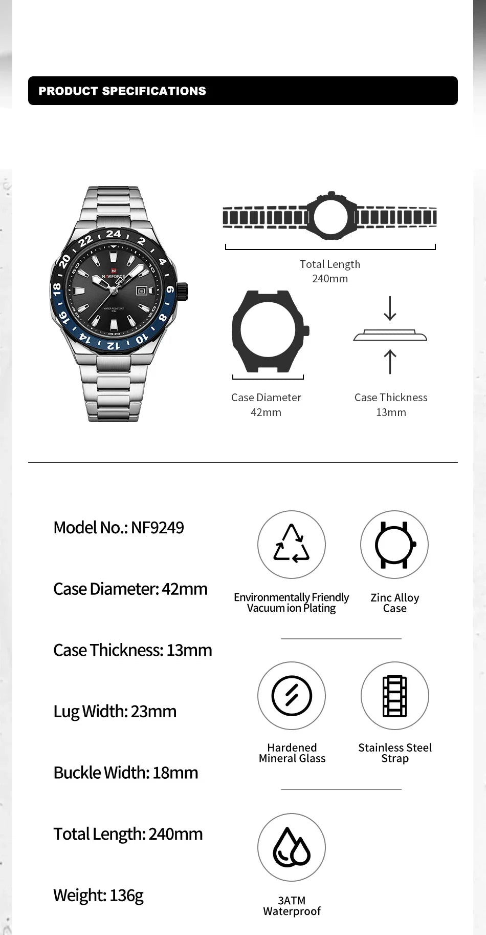 ESPECIFICAÇÕESComprimento da pulseira: 24Tipo de material da pulseira: Aço inoxidávelLargura da pulseira: 20 a 24 mmBateria incluída: SimMaterial das caixas... Leia mais